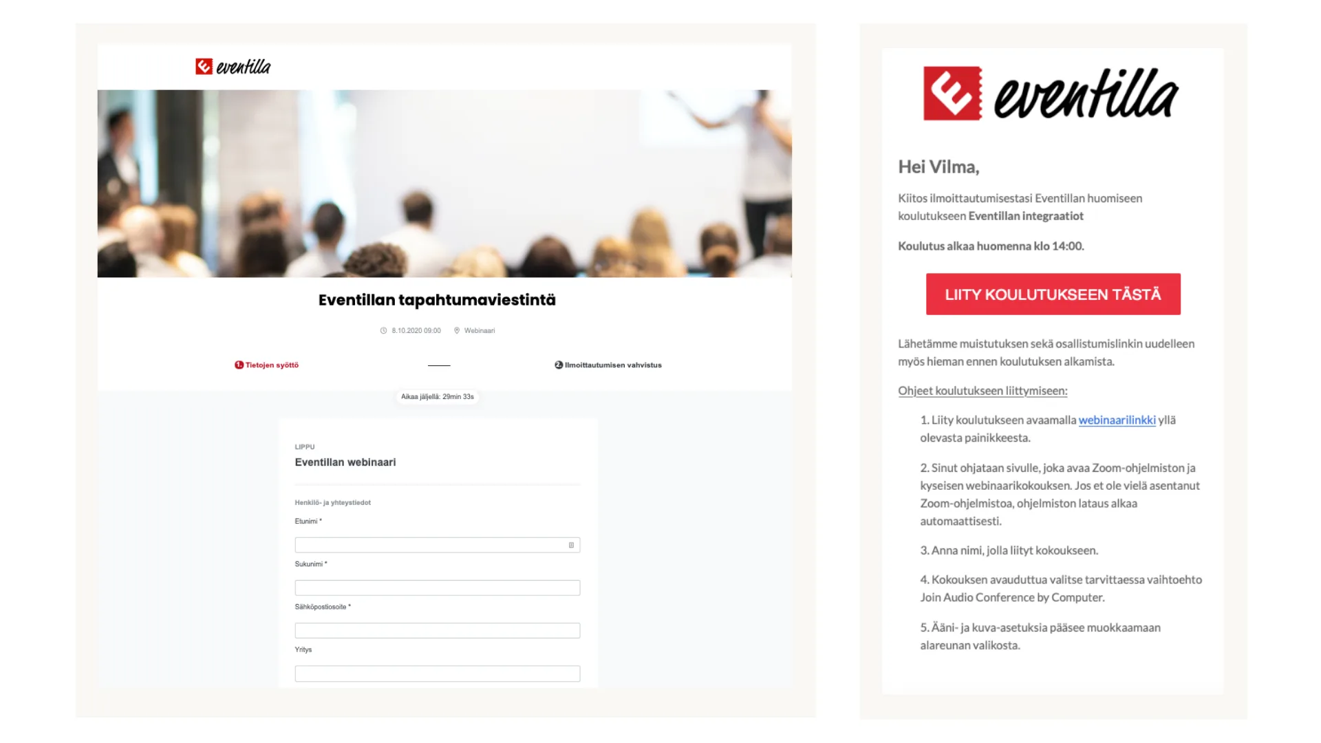 Tässä näet esimerkin Eventillan omasta ilmoittautumislomakkeesta ja automatisoidusta viestinnästä päivää ennen webinaarikoulutusta.