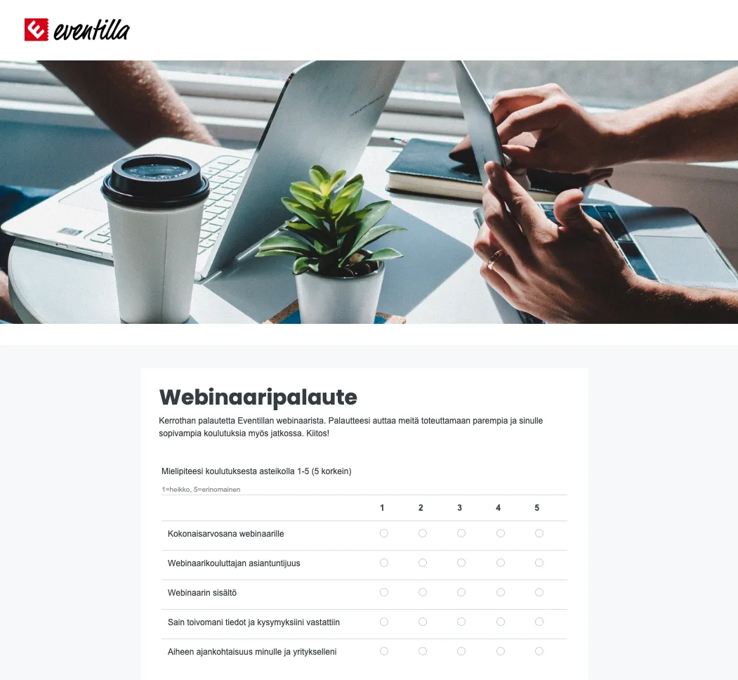 Esimerkki Eventilla Surveysillä luodusta palautekyselystä webinaarin jälkeen