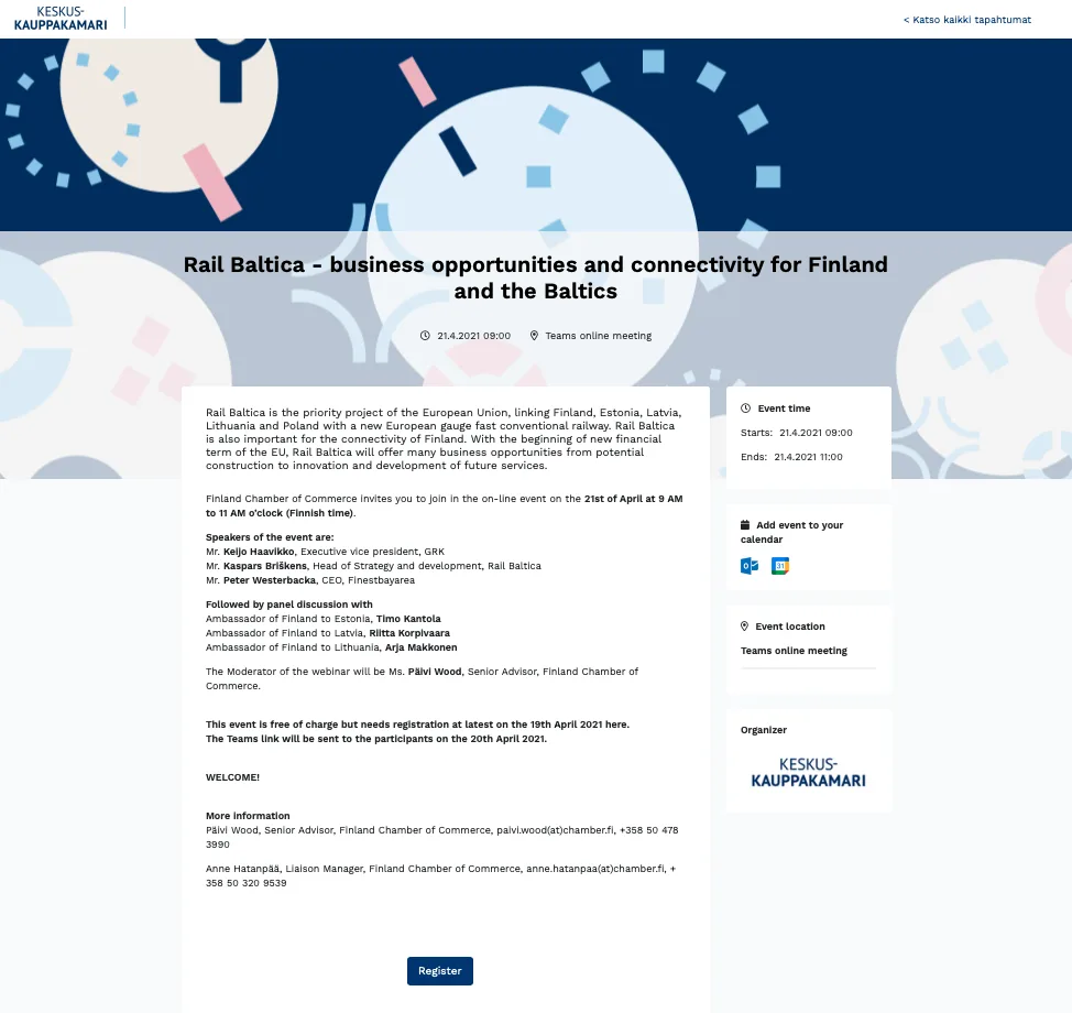 Finland’s Chamber of Commerce has a brand-like event page that includes a broad list of event details, as well as calendar link and organizer logos. Well done!