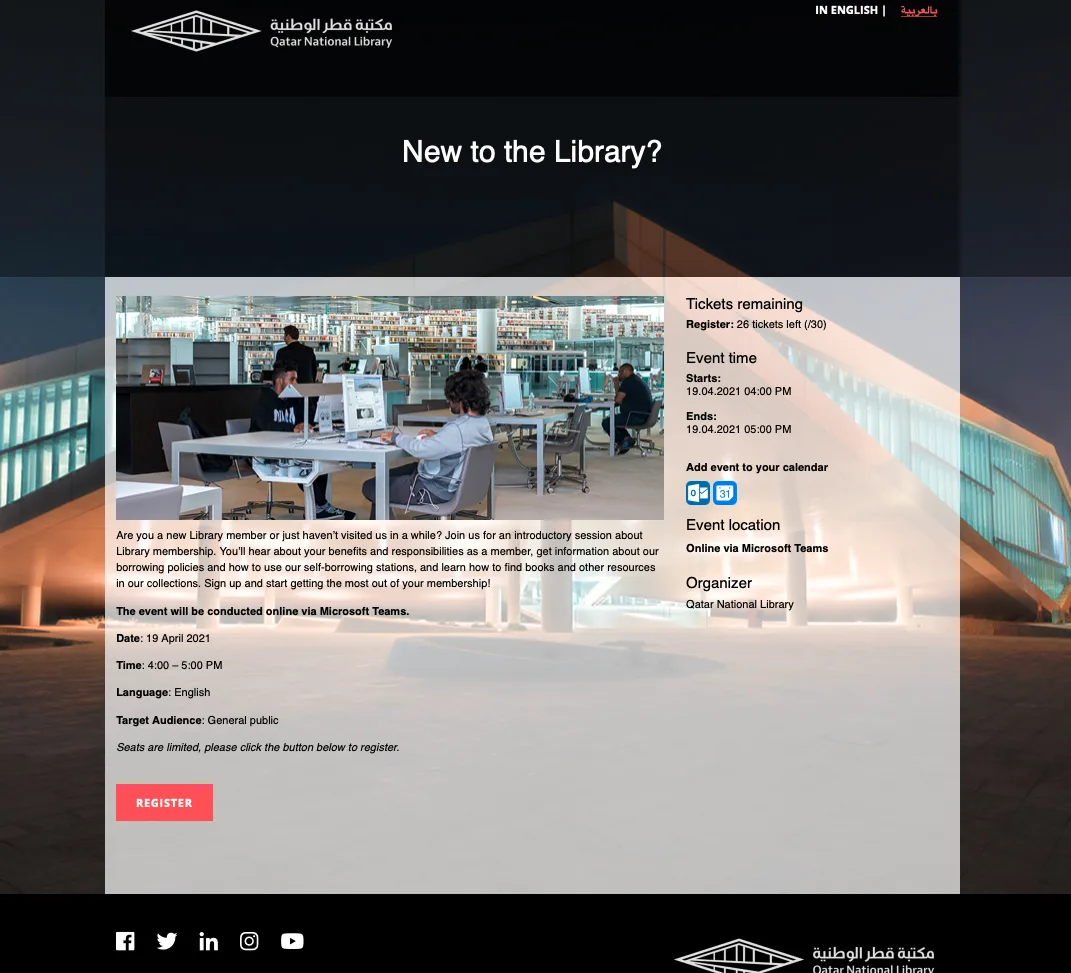 Qatar National Library’s event page is also very brand-like. It offers the needed event details in both English and Arabic. The visitor can also find social media buttons in the footer area. There is also an indication of how many tickets are left. Great job!