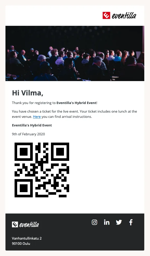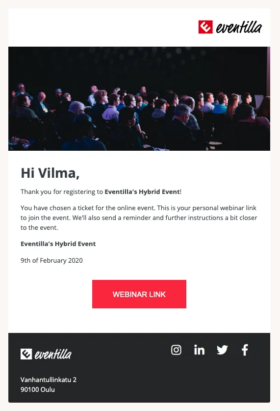 You should always target hybrid event communications accordingly. If the participant has registered for the live event, they don’t need to know about online event instructions. With Eventilla you can target different messages for each participation type.