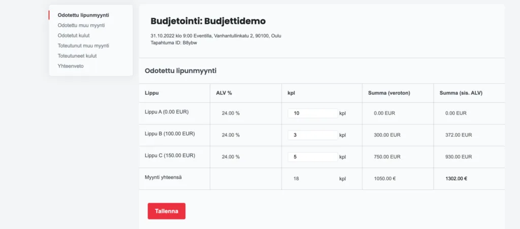 Budjetointityökalu löytyy Eventillasta tapahtuman muokkauksen yhteydestä. Maksulliseen tapahtumaan voi luoda halutun määrän erilaisia lippuja, eli erilaisia ilmoittautumistyyppejä. Usein esimerkiksi ajoissa ostetut liput ovat halvempia “Early Bird” -lippuja, VIP-asiakkaille myydään erikoishintaan lisäpalveluita tai eritellään live- ja onlineosallistumiset eri hintaisiksi. Kun jokaiselle ilmoittautumistyypille on merkitty hinnat, on aika siirtyä budjetointityökalun puolelle kirjaamaan tapahtuman odotettuja myyntejä.