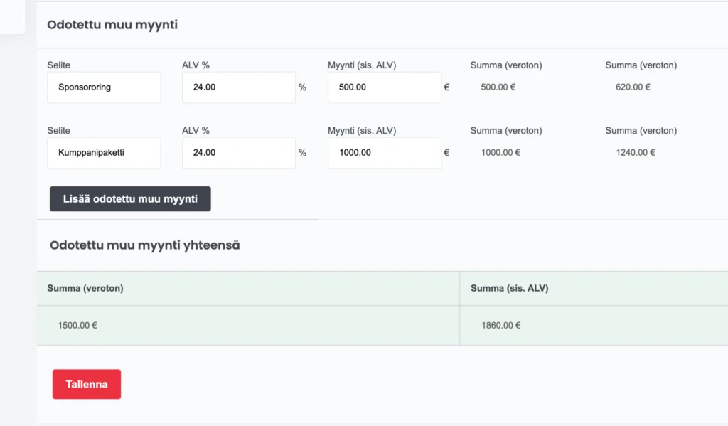 Odotetut myynnit koostuvat lipunmyynnistä ja muusta odotetusta myynnistä. Odotettuun lipunmyyntiin kirjataan yksinkertaisesti se määrä, mitä odotat mitäkin lippua myytävän. Lippujen hinnat täyttyvät työkaluun automaattisesti!