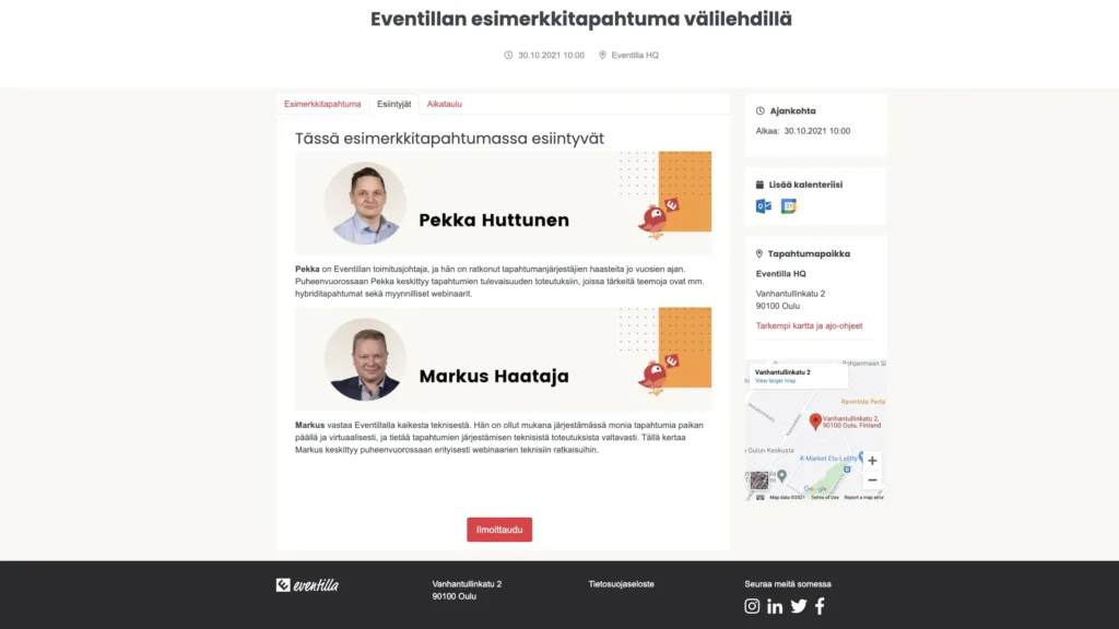 Tässä Eventillan omassa testitapahtumassa on omat välilehtensä sekä esiintyjille että aikataululle. Samanlaiset välilehdet saadaan helposti luotua myös tapahtumasivun eri kieliversioille, jos tapahtumasivusta halutaan luoda vaikkapa myös englanninkielinen versio.